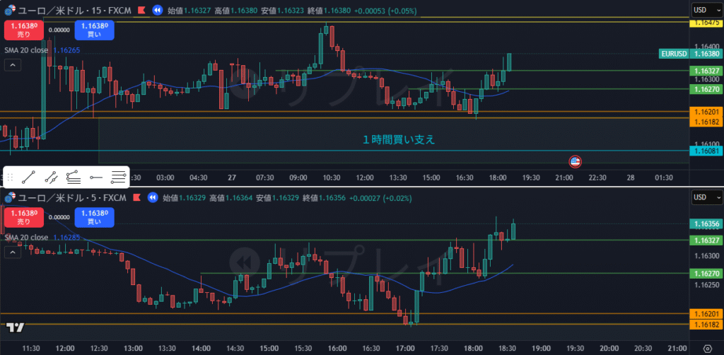 - 1時間はまだ上昇中なので4時間の押し目買いにはならない