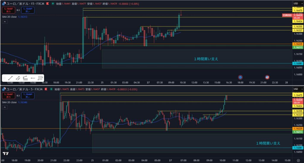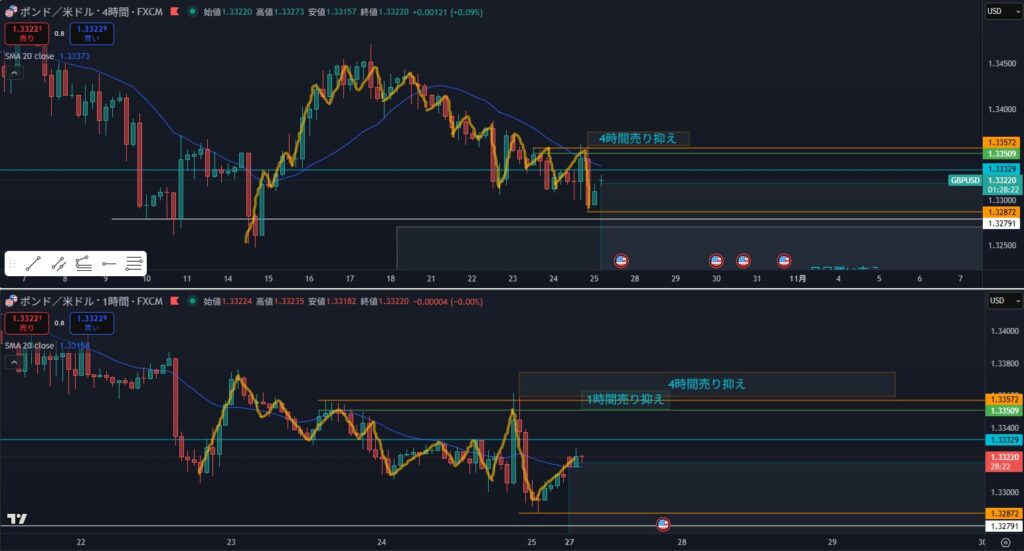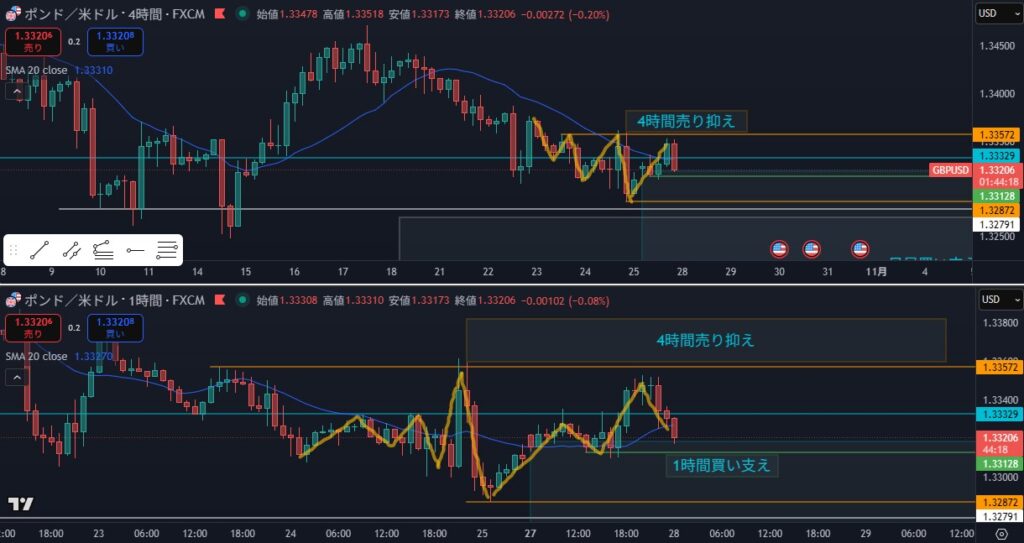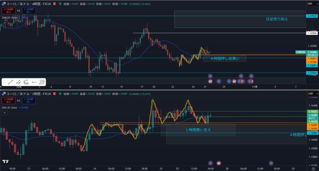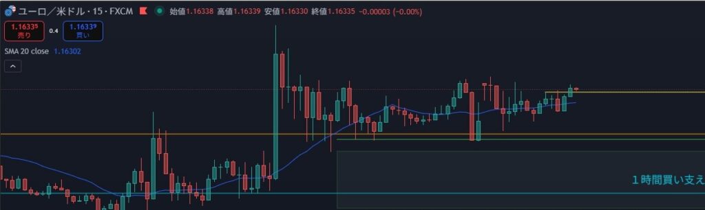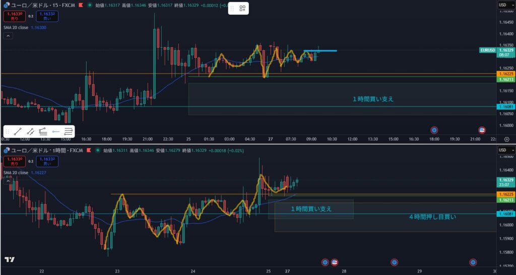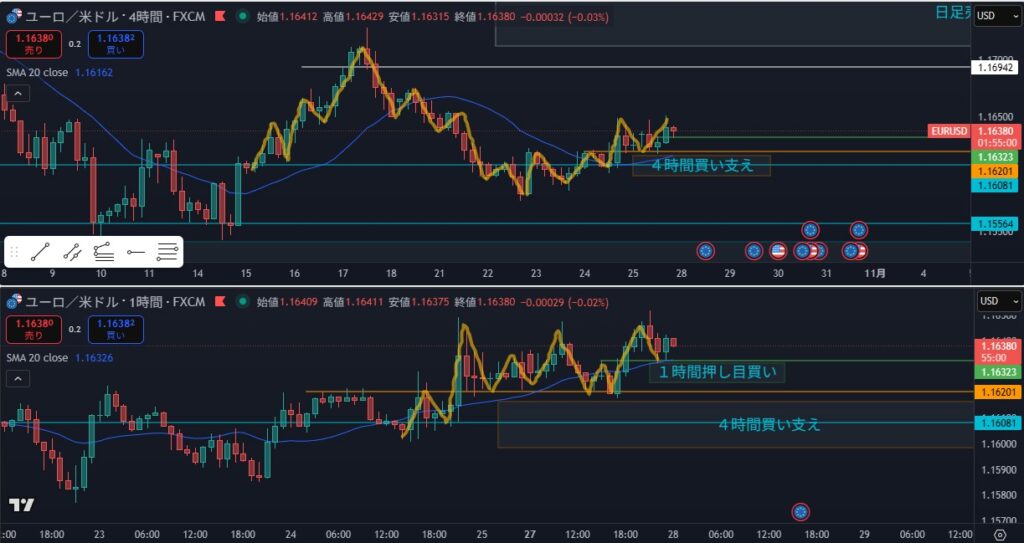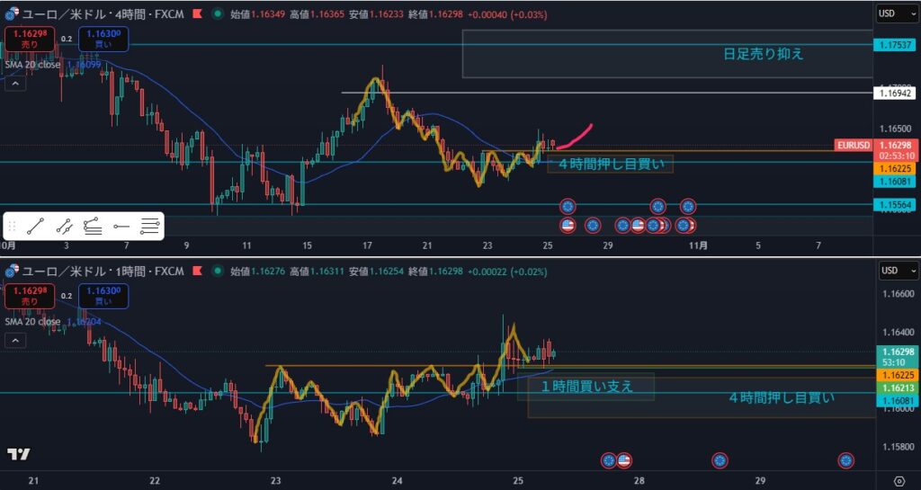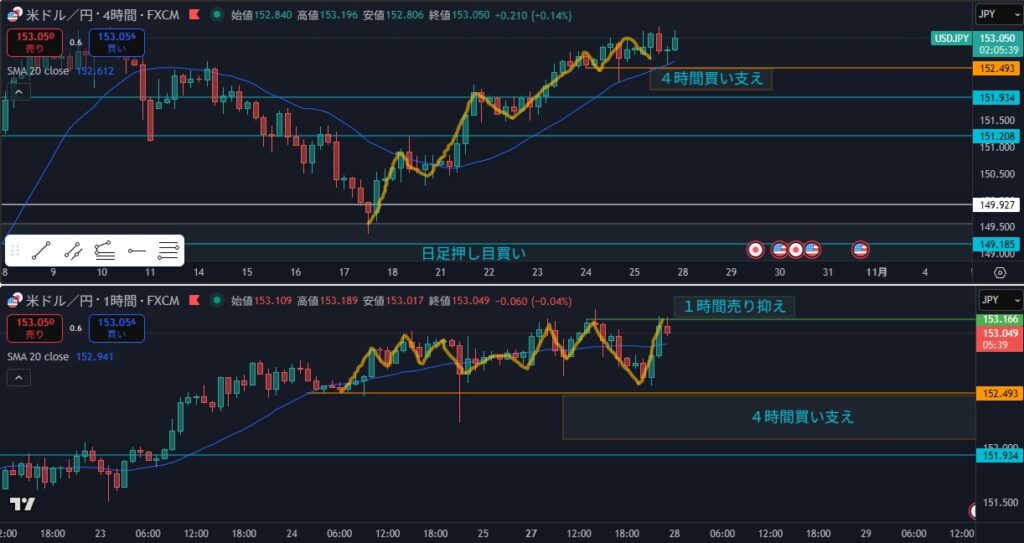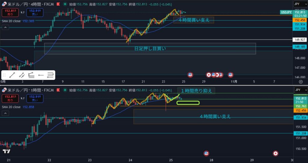 1時間が上のまま、下を向くのを待つとなると4時間の押し目買いエリアを抜けてくる