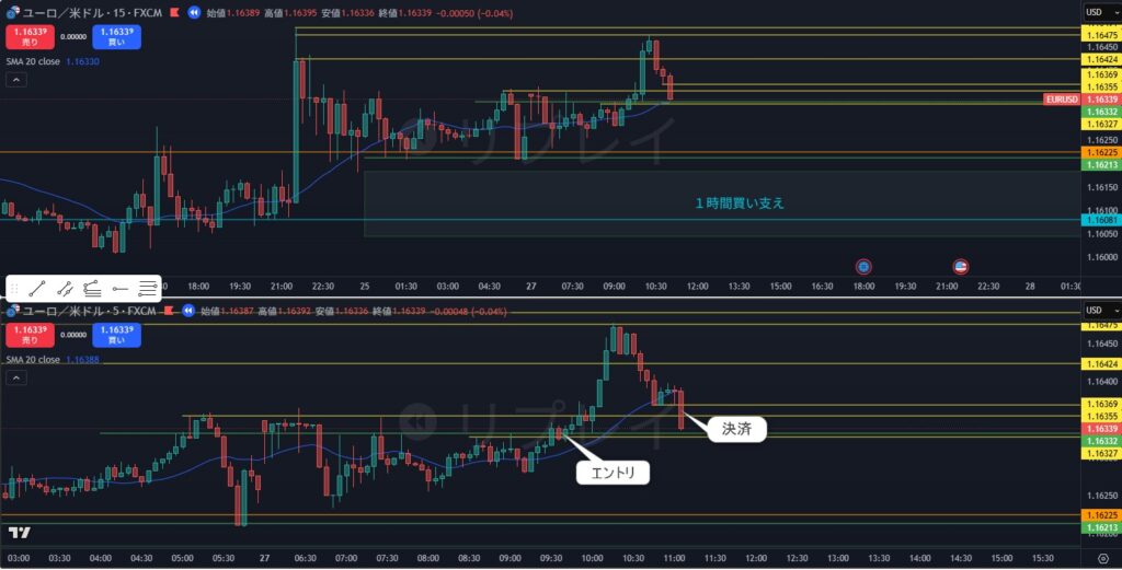 前回高値&日足MAの所。この辺りで半分決済、残り半分は15分安値の下にストップ