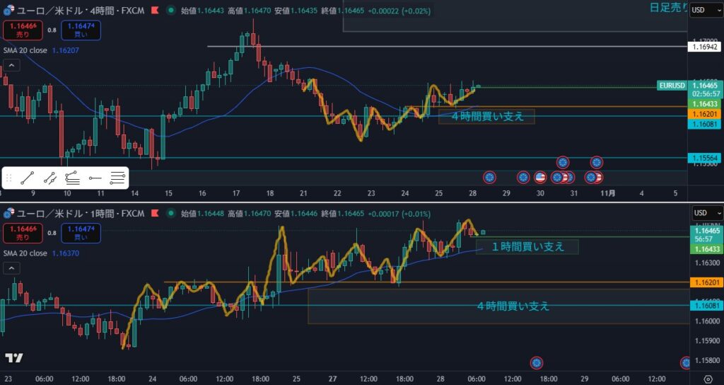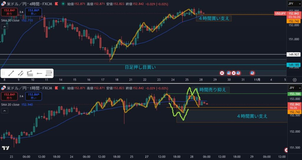 - 日足の押し目買い、4時間の斜め抜けが良い(軸足を上げる)