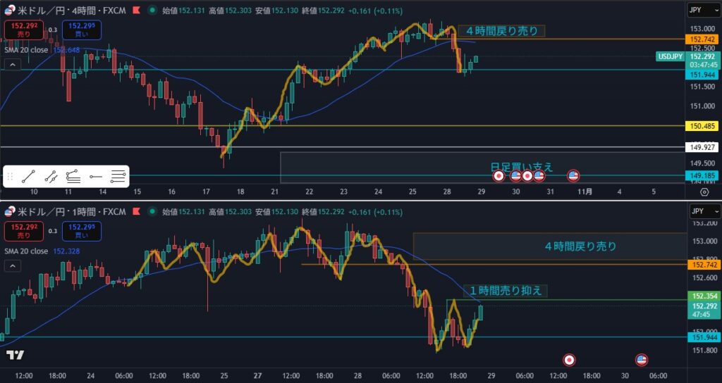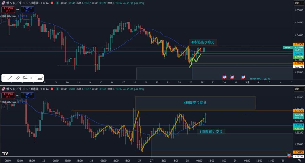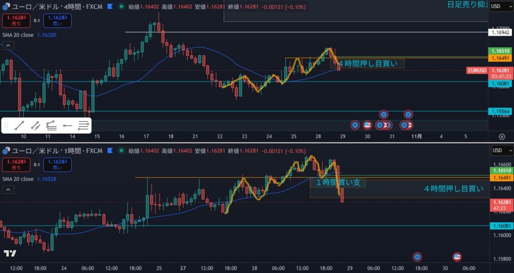 - 4時間足の押し目をつけている最中に1時間足が下目線になる