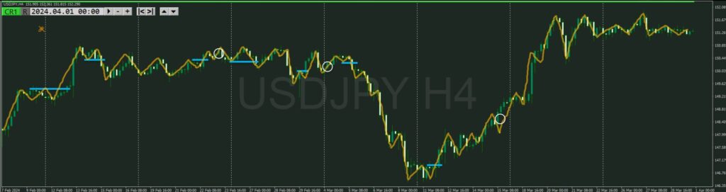 5分足でエントリを狙うとなると、4時間1本で5分48本分の中から波が出るところを見つけるのはかなり難しい。入るなら覚悟するしかない