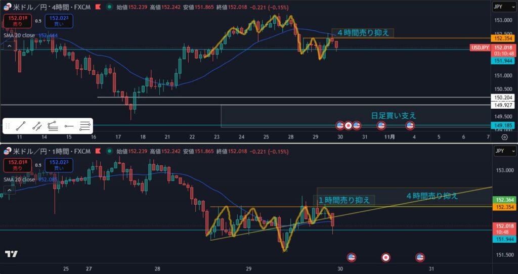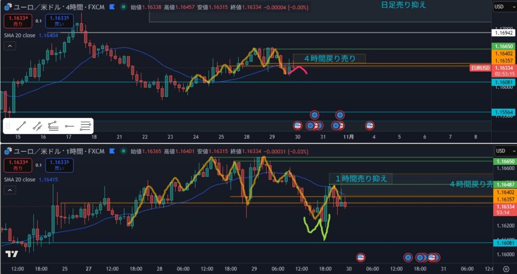 - 狙い:4時間戻り売り?(下落継続か?)狙いは1時間攻防ライン抜け