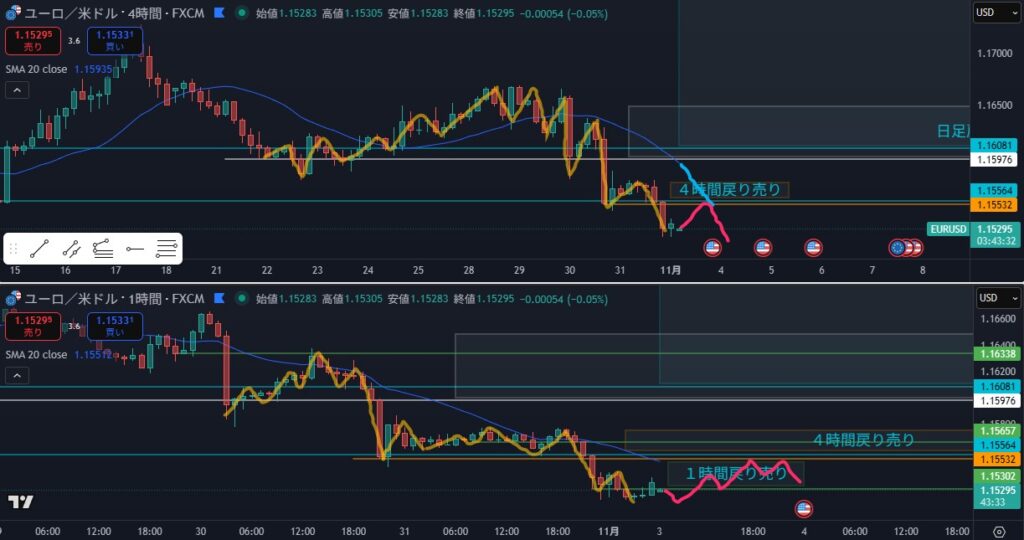 - 4時間の戻り売り狙いの為、戻しをも待つ