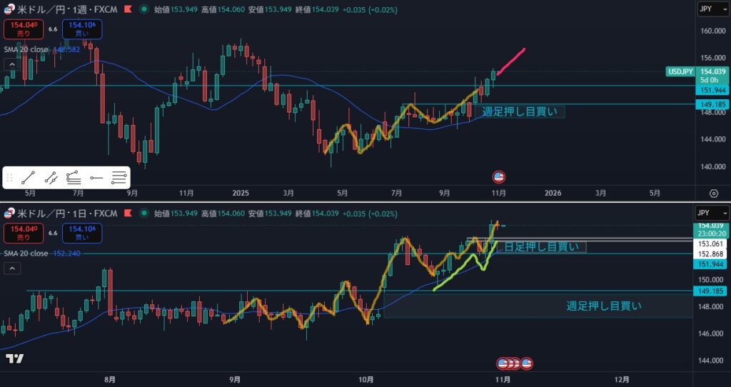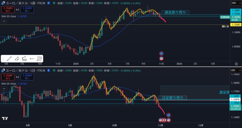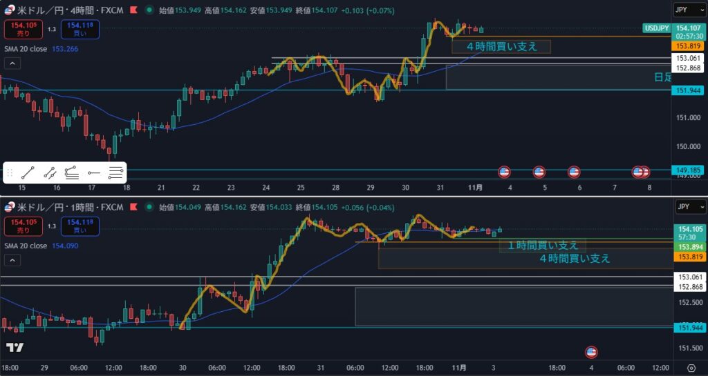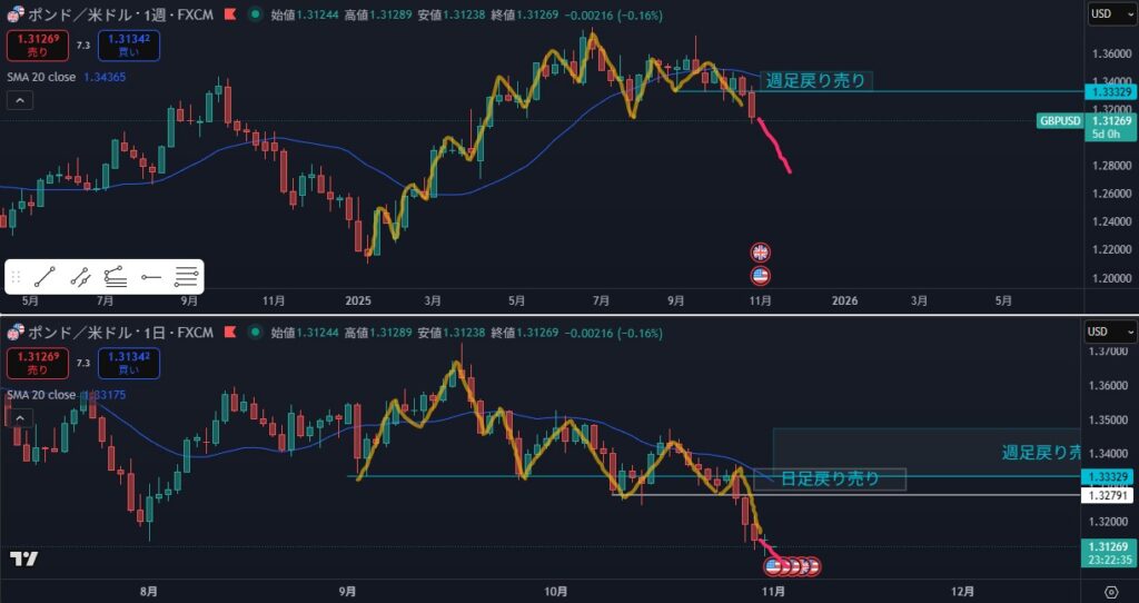 週足が下目線になったことで分かりやすい構図になった、指標前にエントリポイントが来た場合ポジションをどうするか悩ましい。流れ的に全決済はせず、小ロットは残す。