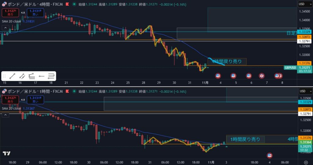 - 4時間の戻り売り狙いの為、上昇転換を待つ