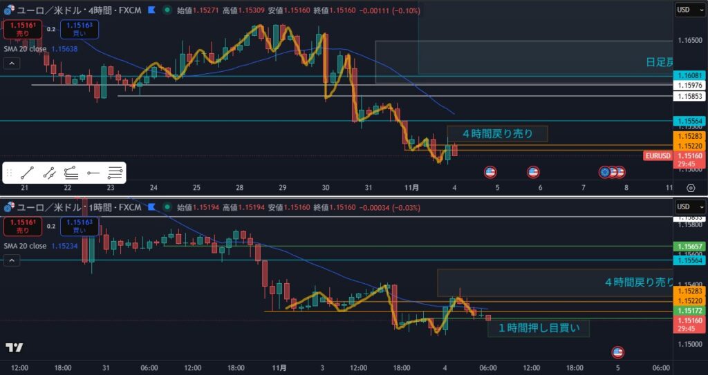 - 狙い:4時間戻り売りの戻し待ち。観察する