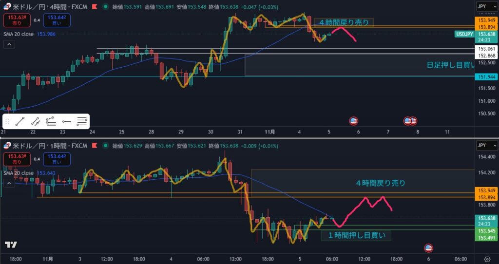 - 狙い:4時間戻し待ち、1時間押し目買い(条件が整えば)
