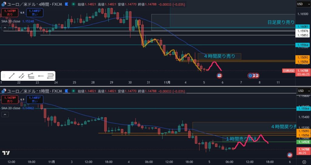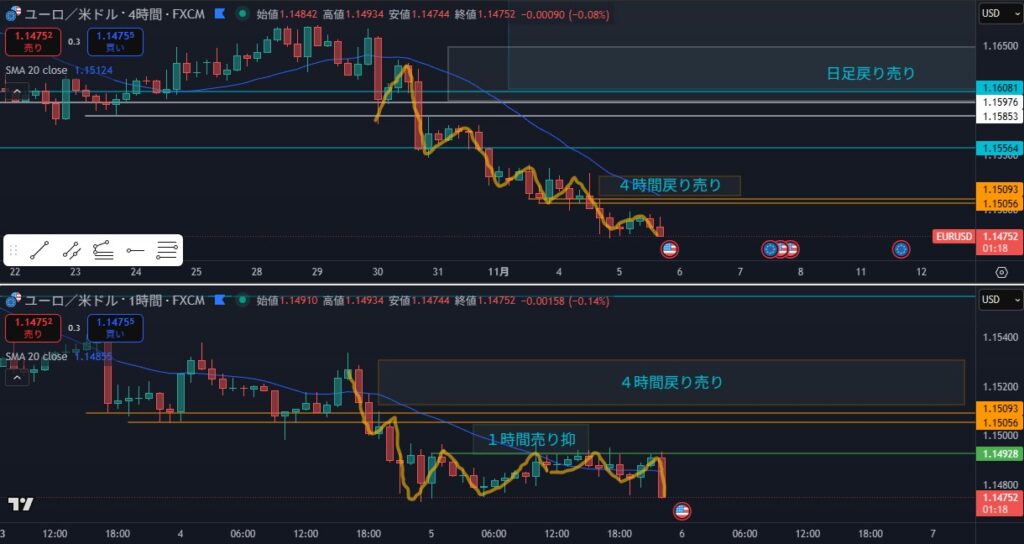 結果:4時間の戻り売りエリアまで戻さずに、1時間の戻り売りエリアから再下落