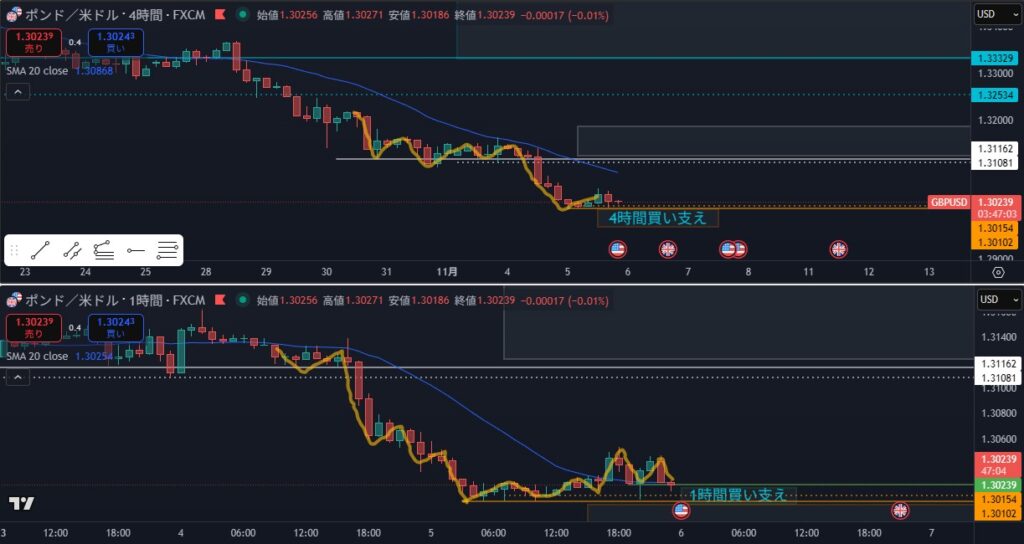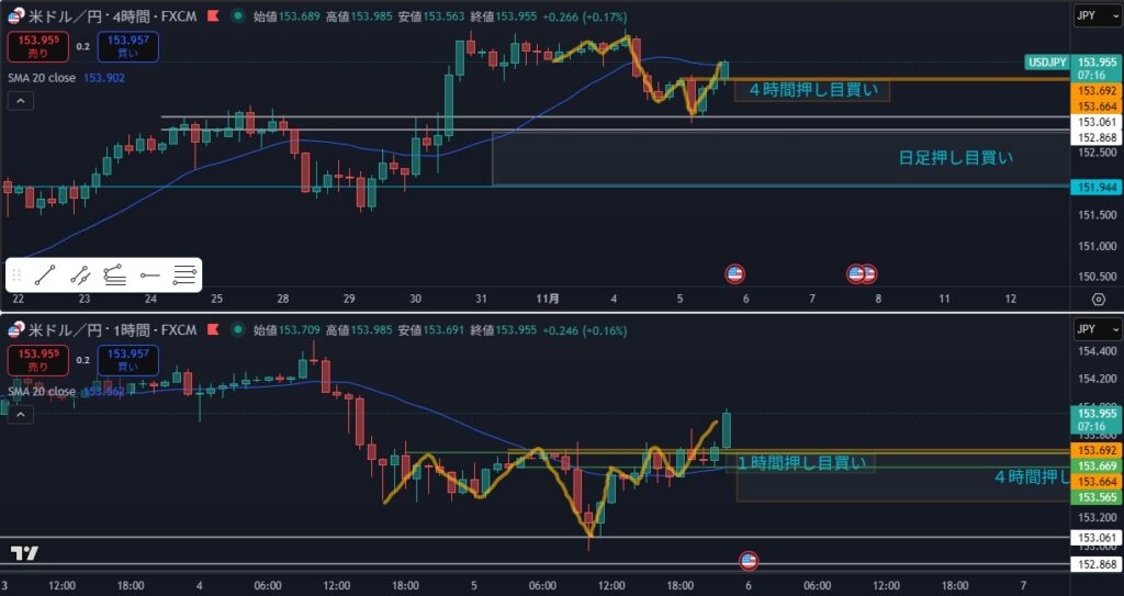 - 狙い:4時間戻し待ち、1時間押し目買い(条件が整えば)