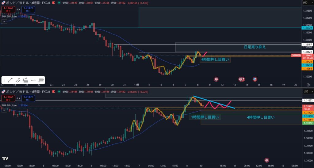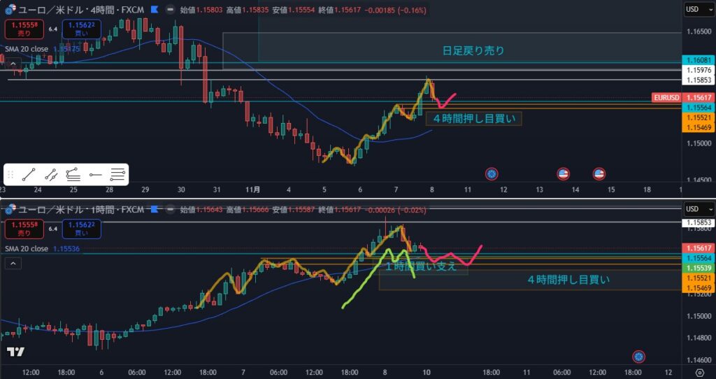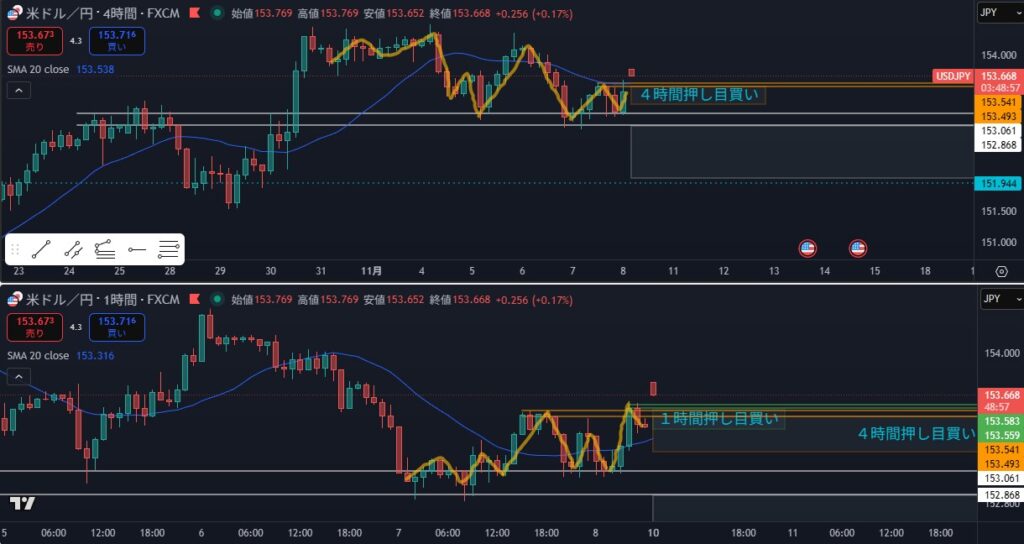 ※追記:1時間押し目買いの位置が違う。無意識に前々回高値を見ていた