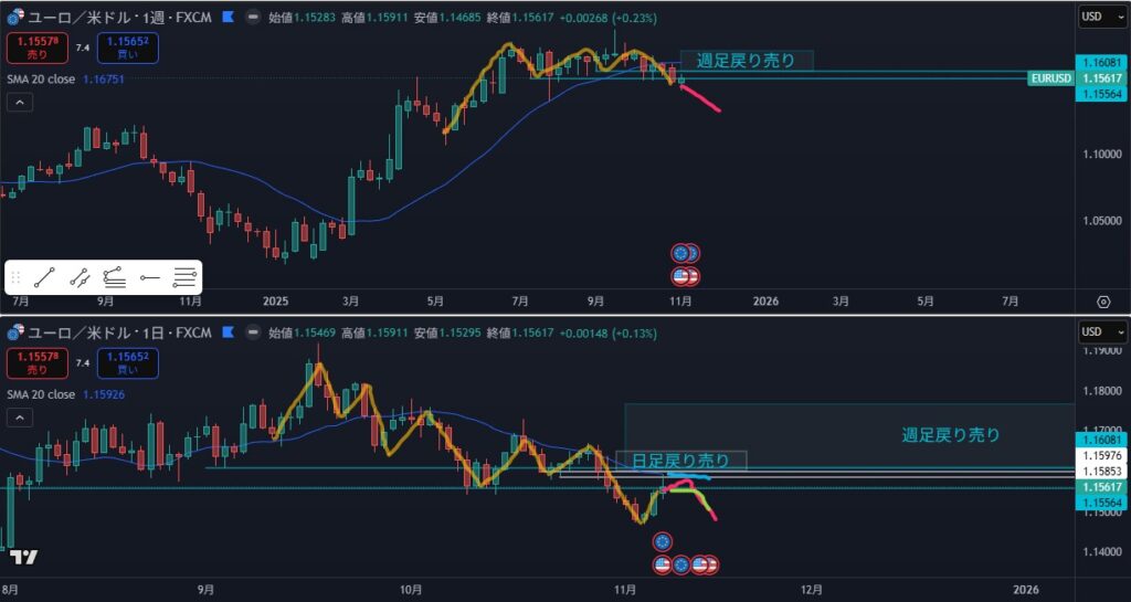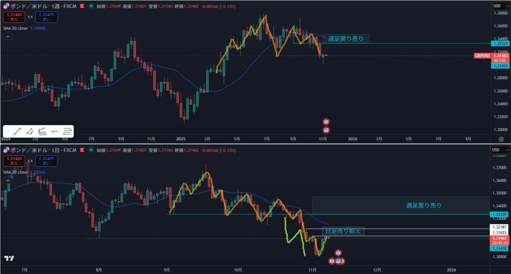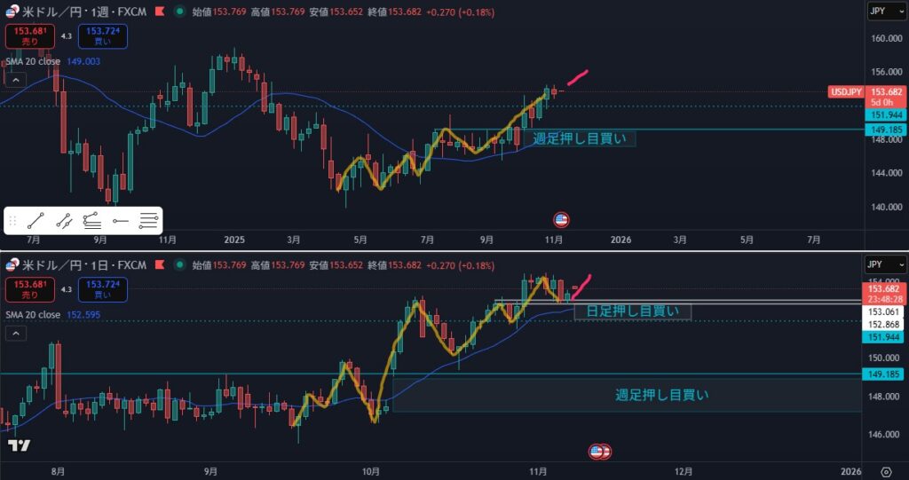 - 狙うとすれば4時間押し目買い、日足リスクからロットを落とすことになる