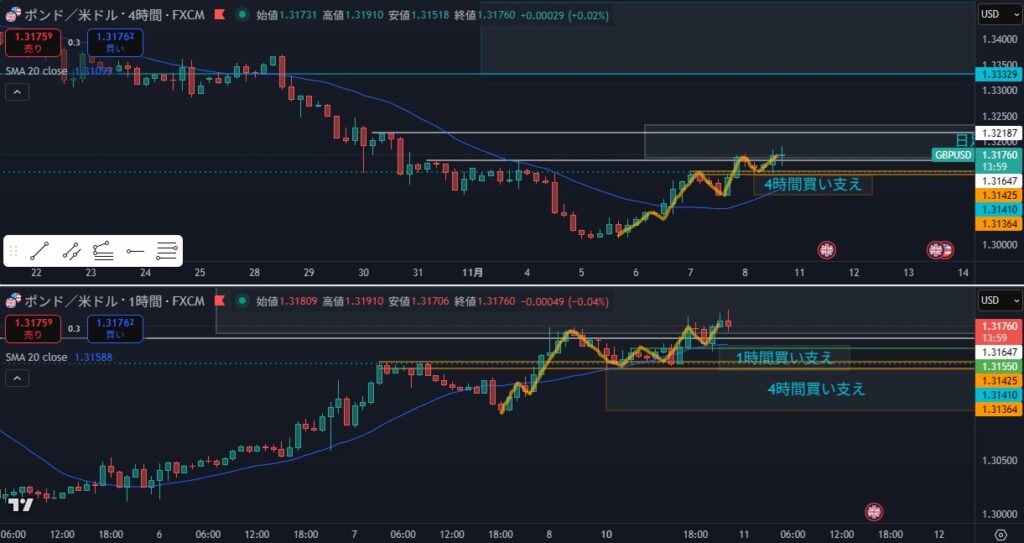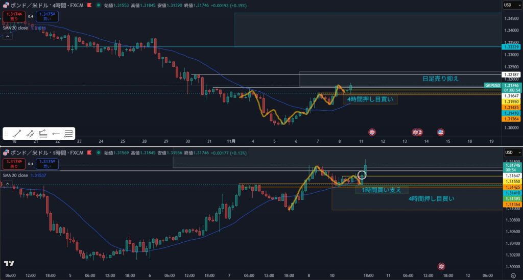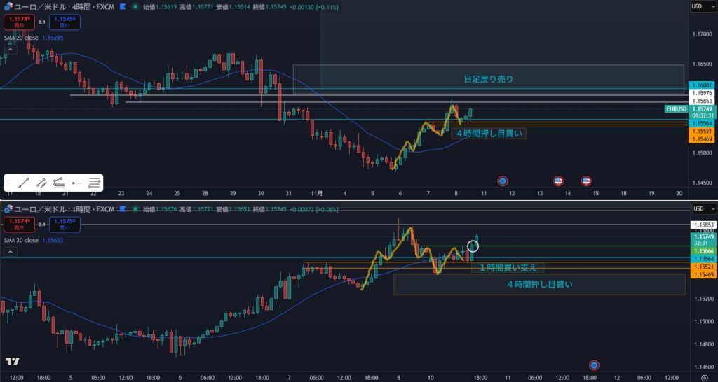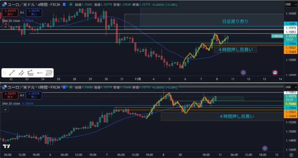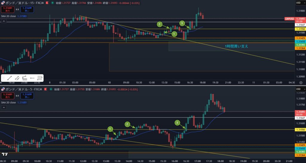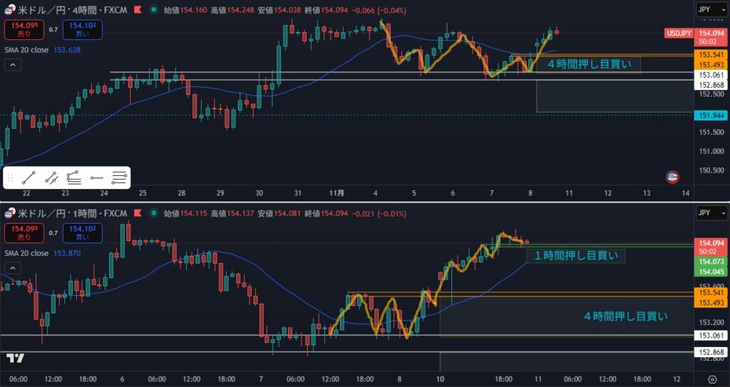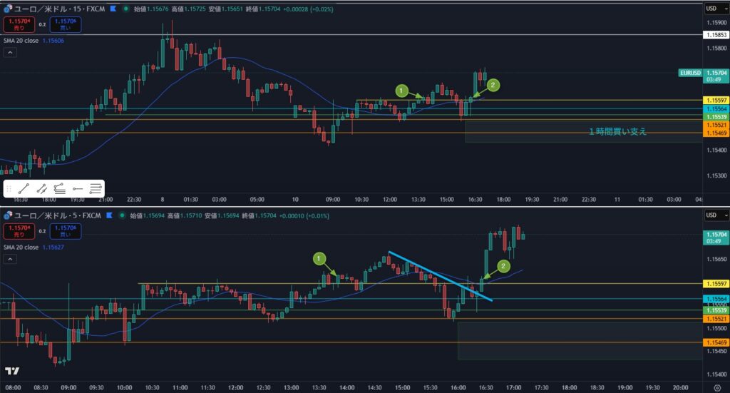 ※追記:1時間押し目買いの位置が違う。無意識に前々回高値を見ていた