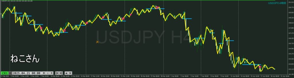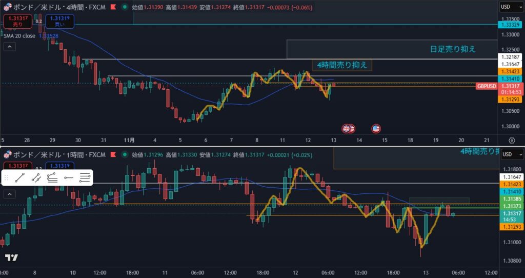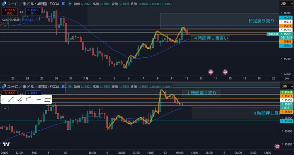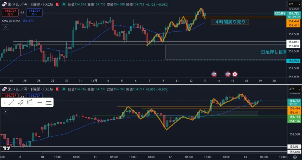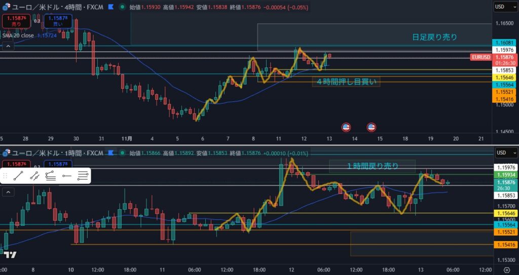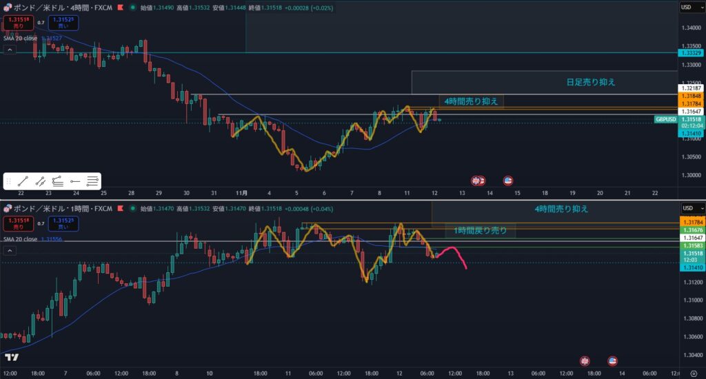 - 4時間は下を向いているため、1時間の戻り売りを狙いたい