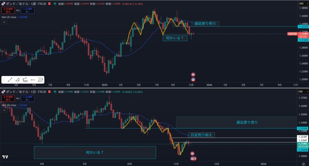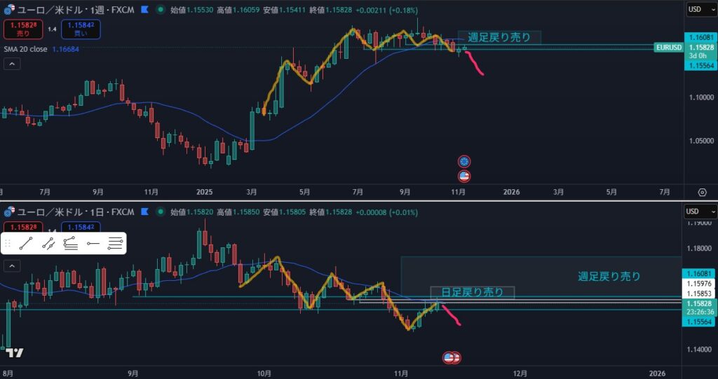 - 日足戻り売りエリアまで実体でしっかり戻してきた