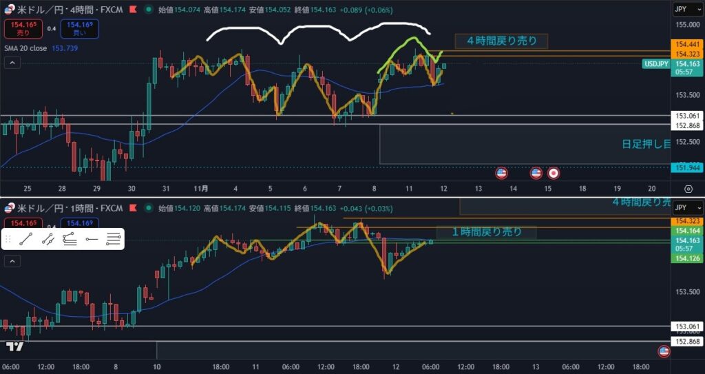- 日足の戻りうり、4時間の押し目買いに挟まれている