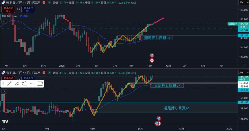 - 日足の押し目買いが入ったがまだ高値越え出来ていない