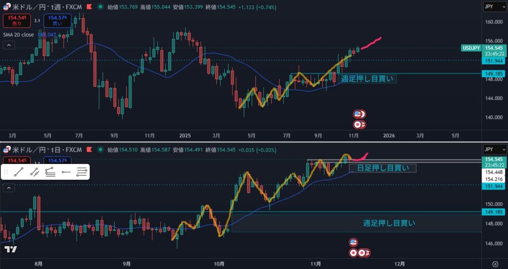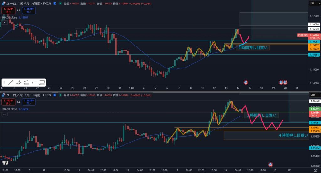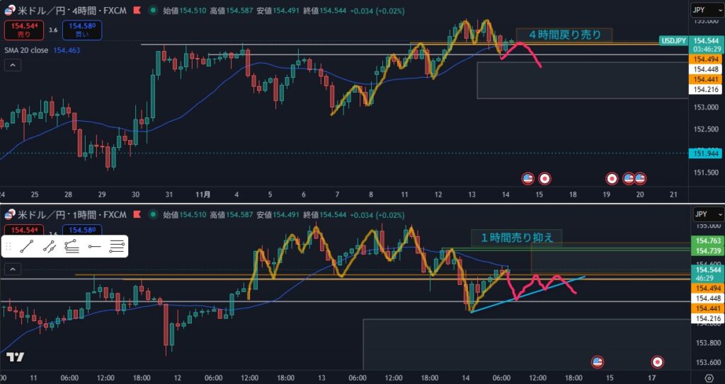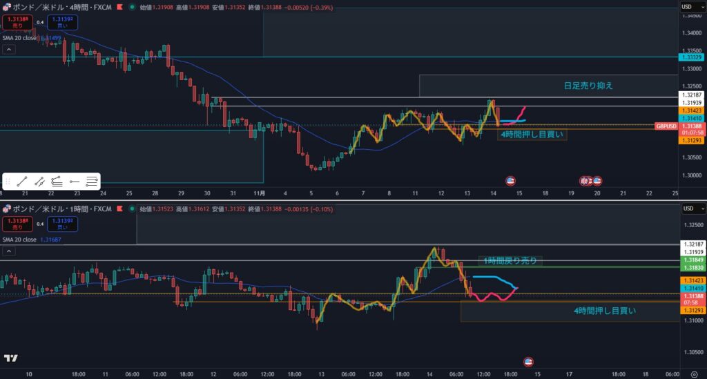 - 日足押し目買い、4時間戻り売りが同じラインであるため、狙えない。逆行リスク