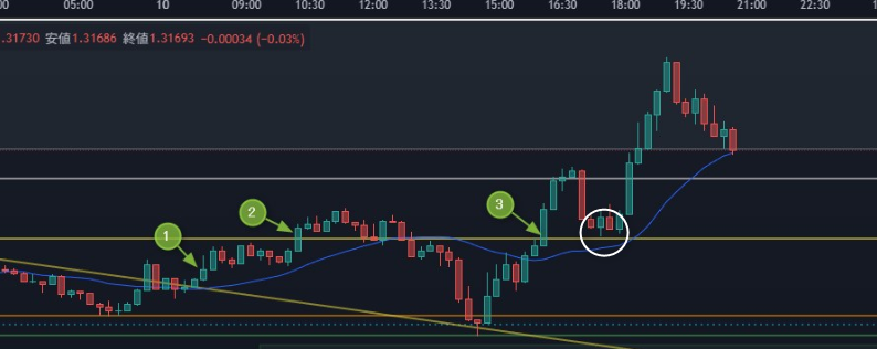 1時間足の資金がドンと入ったところを見て、4時間のラインを引く