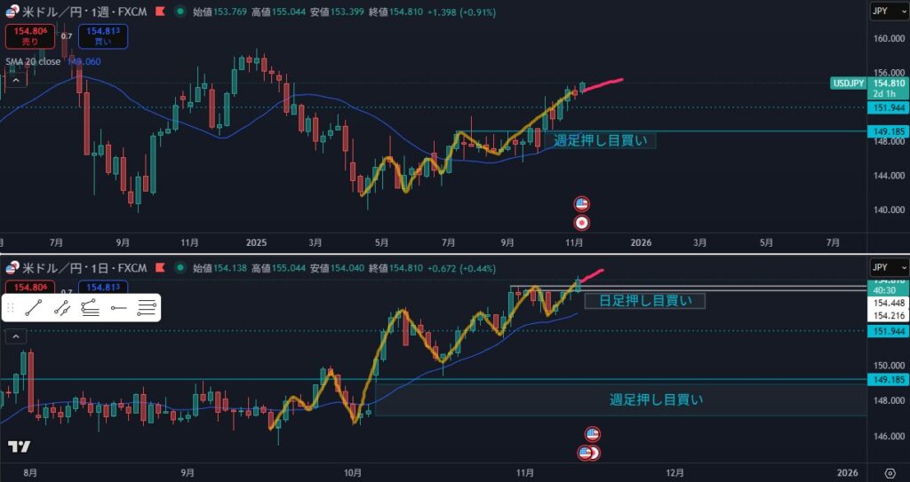 - 1時間が下を向いた場合は、押し目買いエリアで反転を待つシナリオ