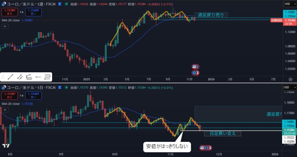 - 前回安値の位置がはっきりしない、どこで止まるかを見ていく