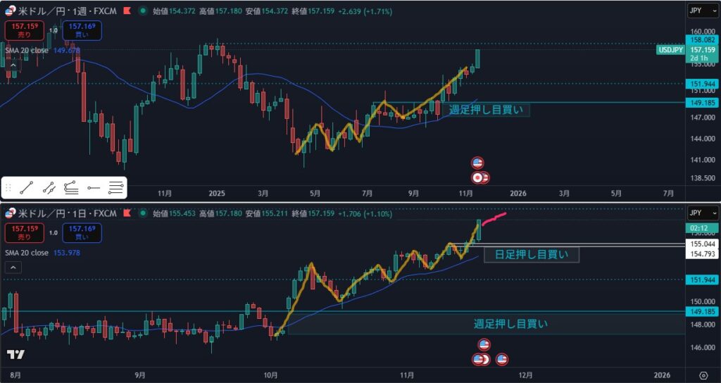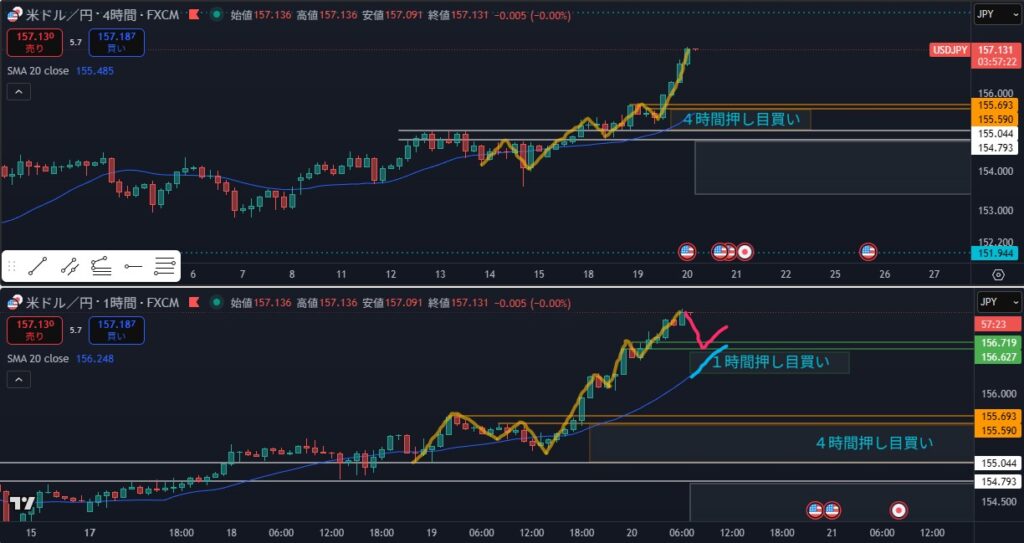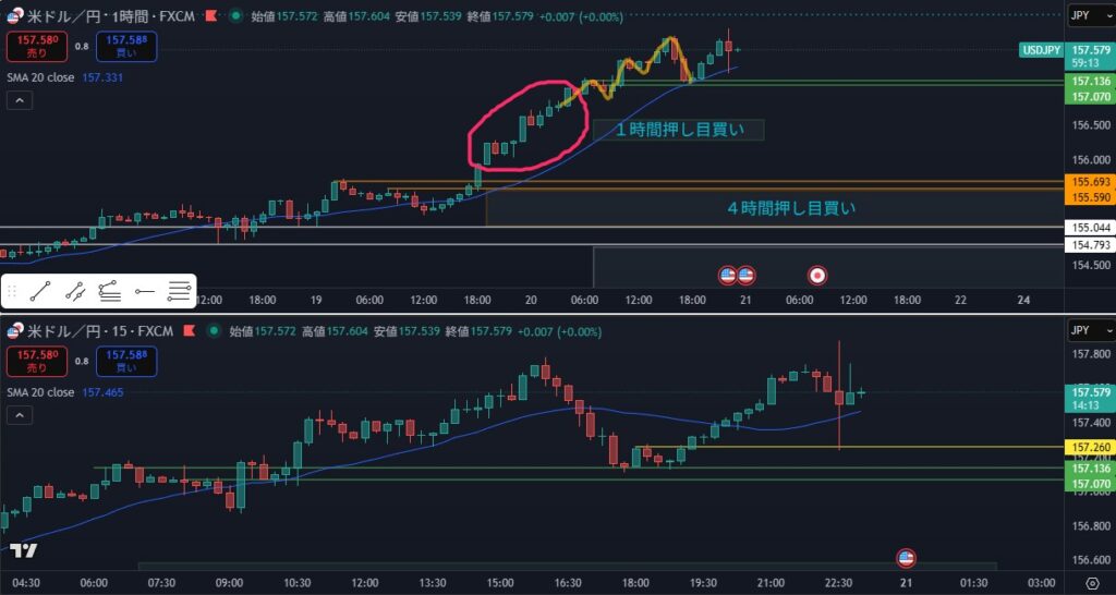 日足の押し目買い「入らないのかよ!」の大陰線、4時間の波ではない。