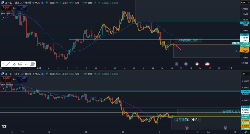 - 4時間としては静観する場面だが、日足がピンクダウの場合は攻防ラインを待つことになる