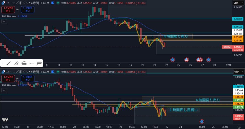 結果:下落したがまた4時間売り抑えまで戻した