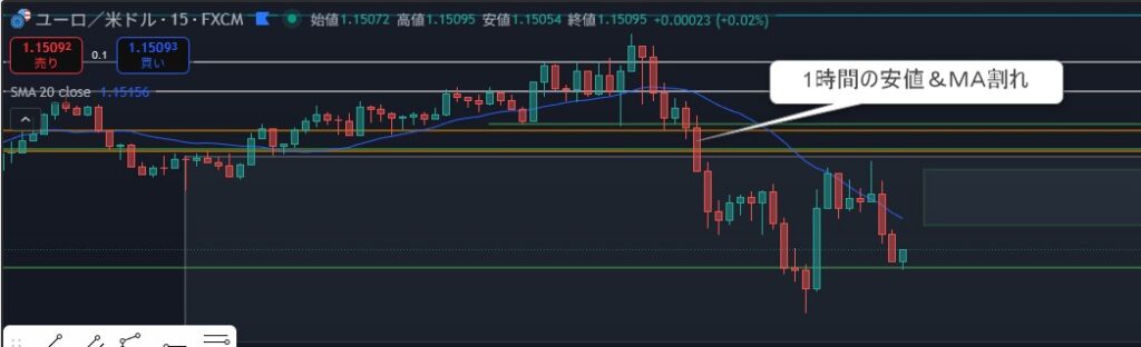 下画像15分:入るとすればここだったか。このパターンは損切りが広くイヤな感じ、そのまま下がったからいいけど