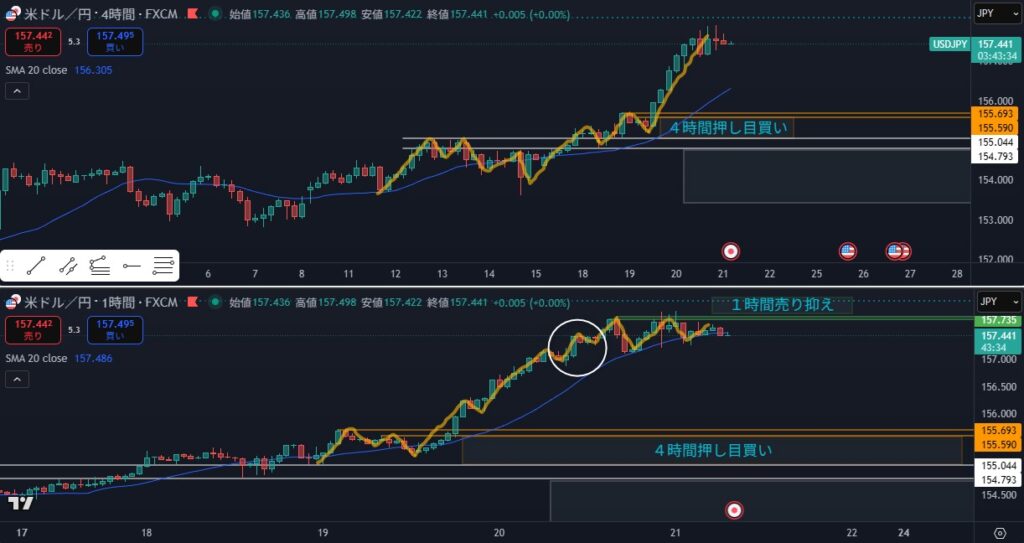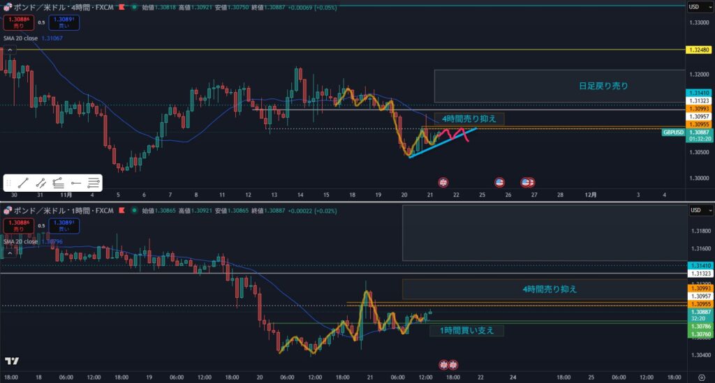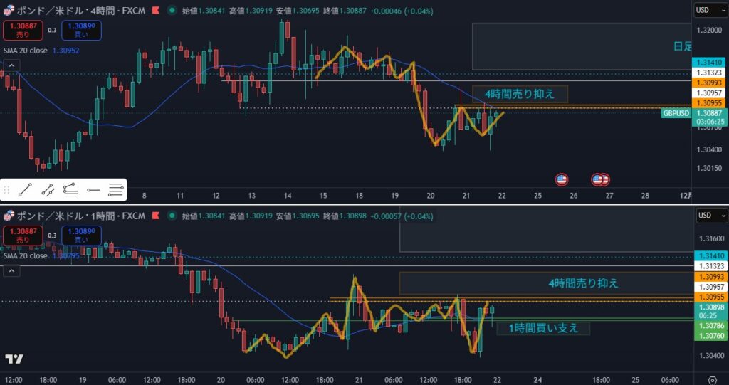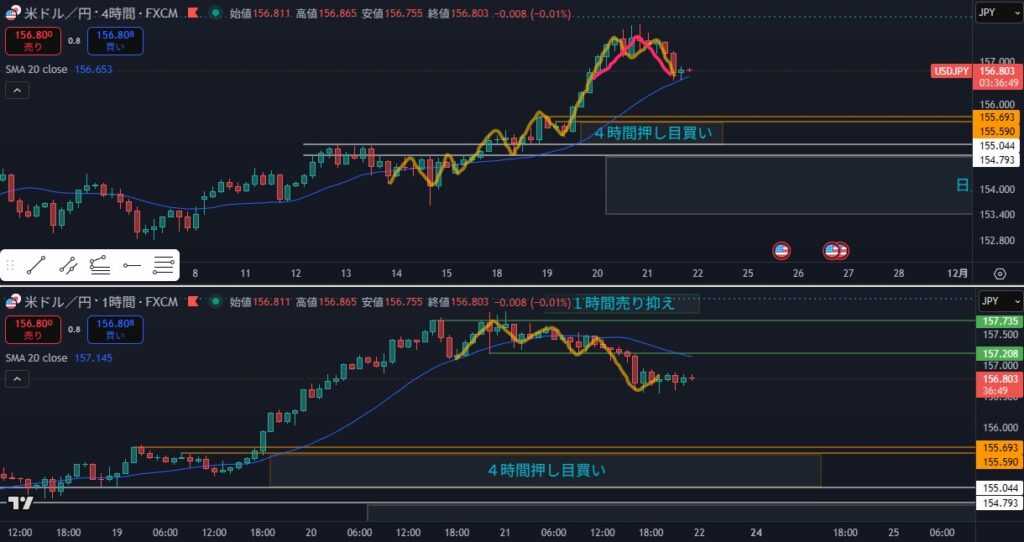 - 4時間としては静観する場面だが、日足がピンクダウの場合は攻防ラインを待つことになる