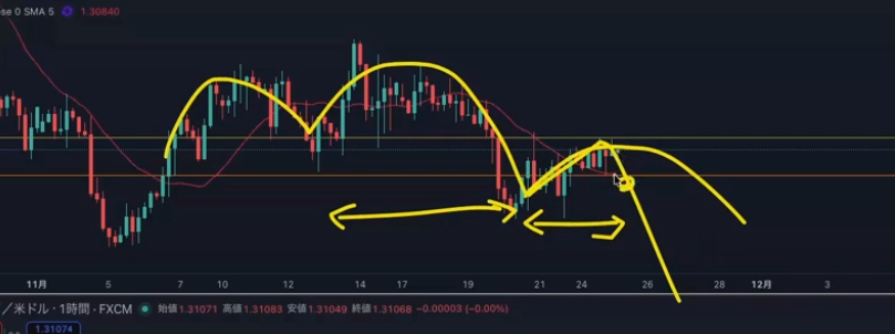 - 一度全戻しからの売りが入って安値割ったあとに、また全戻ししたように見える