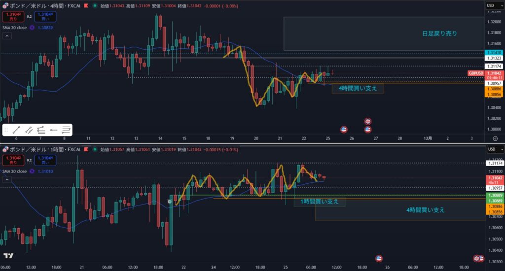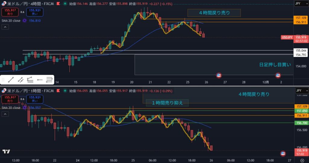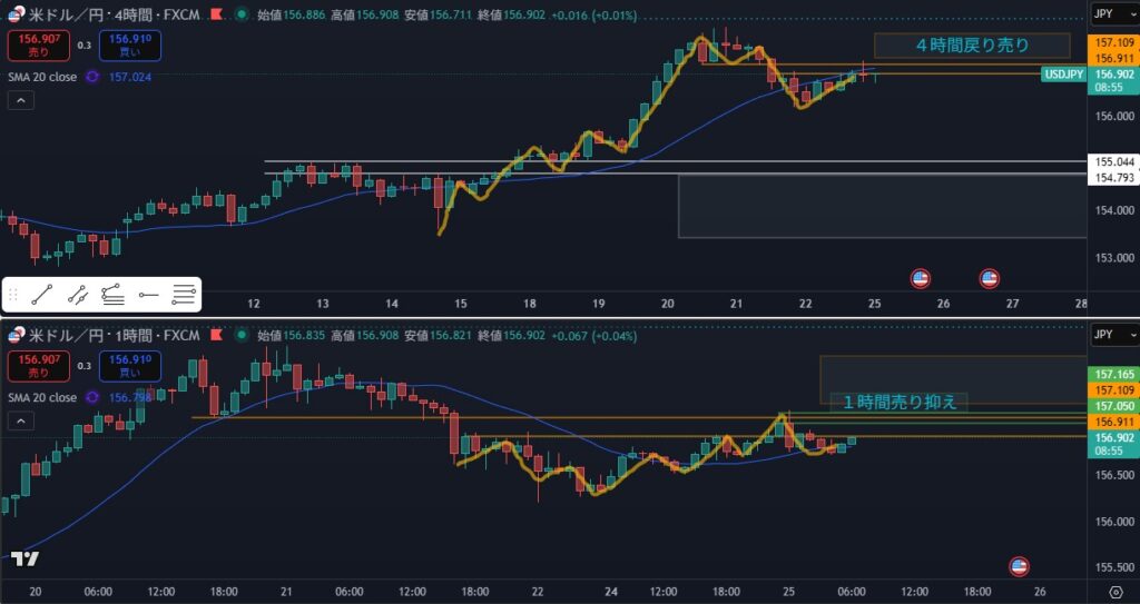 4時間の全戻しとかじゃなく、日足の戻り売りになるのか見た方がよさそう