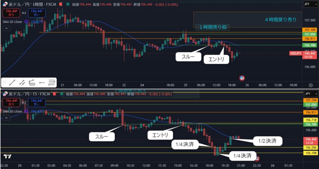 黄ライン②で半分決済の予定だったけど、ヒゲで戻されたのを見て1/4決済