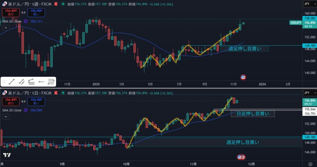 - リスク:日足安値がはっきりしない、日足の伸び切りリスク