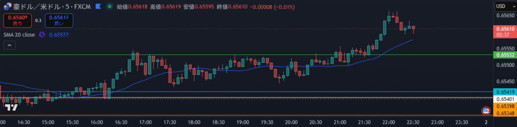 21:30 緑ラインでの攻防、止まれー。5分のMA割ったら一旦損切りの予定