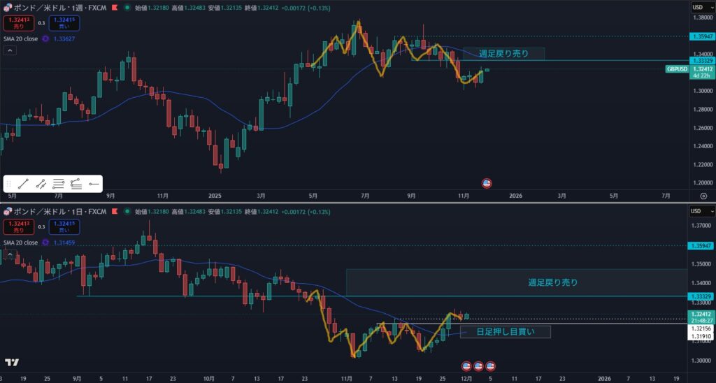 4時間足、日足の戻し過ぎからの下落をリスクとして考えておく