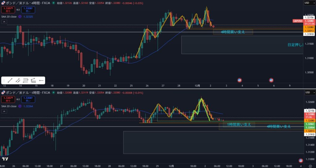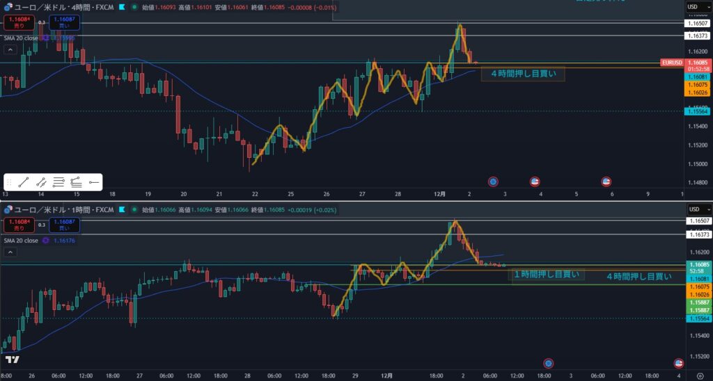 - 4時間の売りと日足の買いが両方いるエリアになる