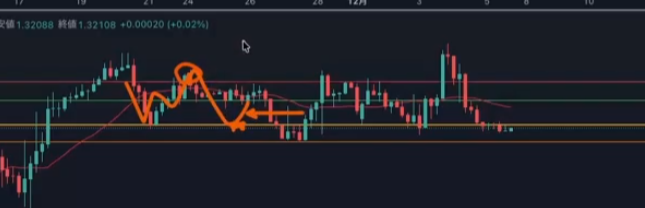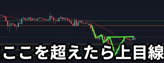 このダウカウントの場合ここを越えたら上目線。越えたロウソクを見て転換したかどうか判断するしかない
