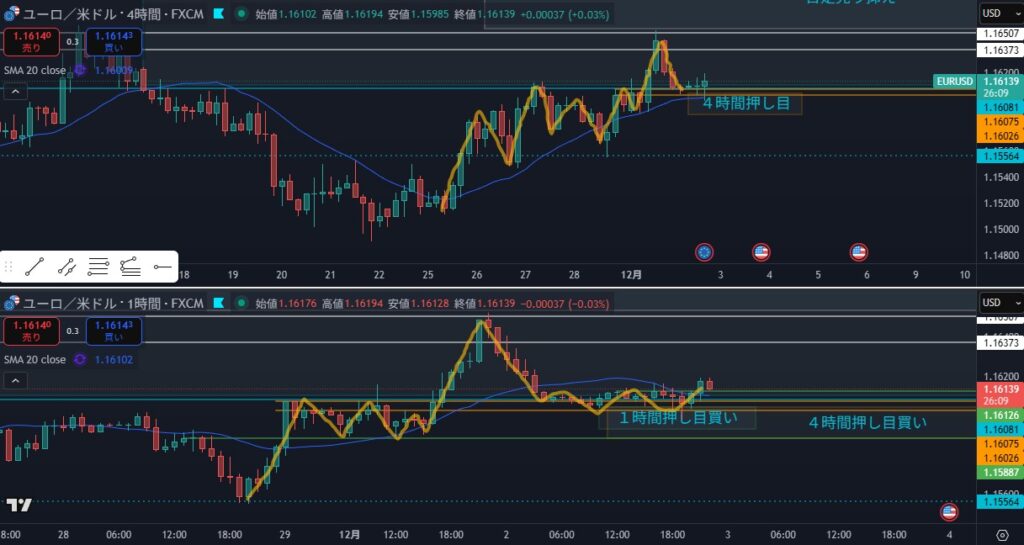 - 4時間が上昇転換するタイミングがエントリポイントになる