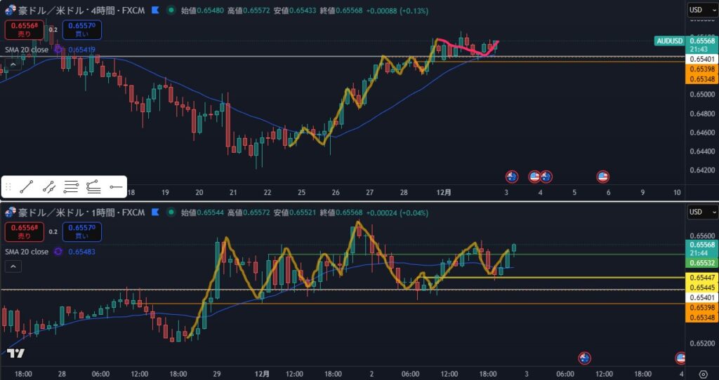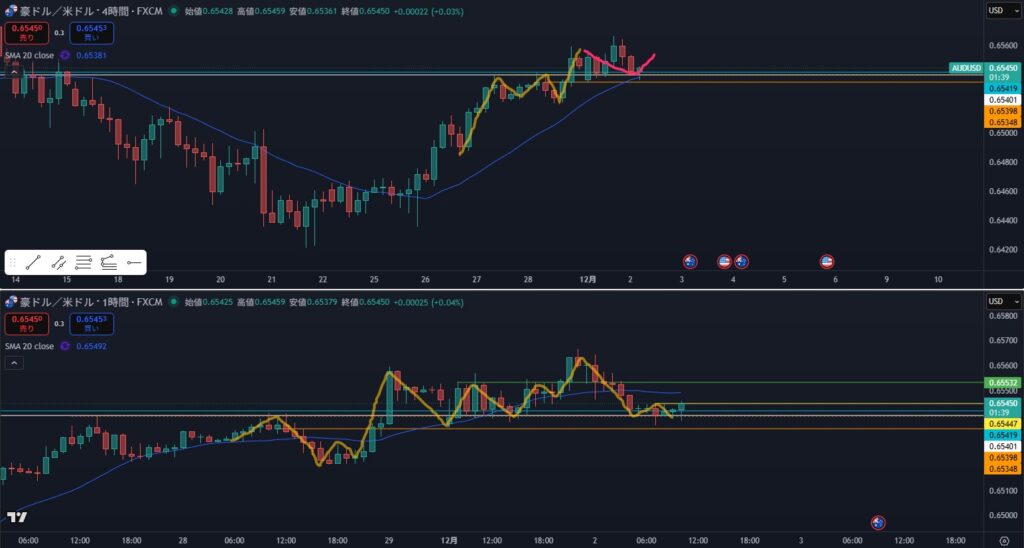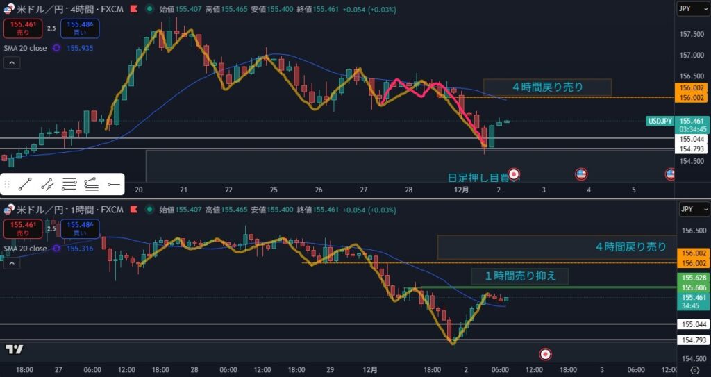 朝の認識:4時間の戻り売りはMA的に狙えない、4時間の売りと日足の買いで戦争になりそう