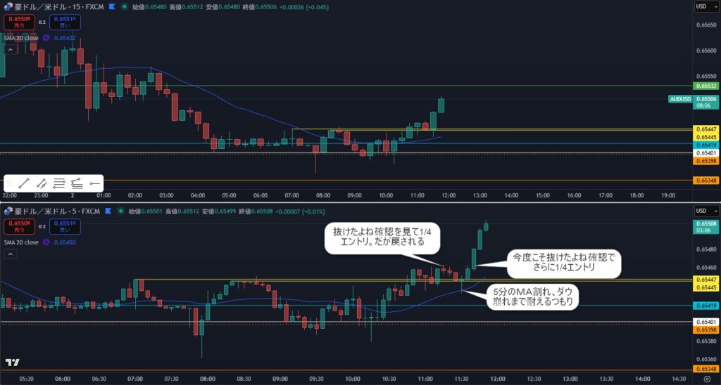 11:40 さらに1/4エントリ、ここも確定を待たずに覚悟を決めて入った
