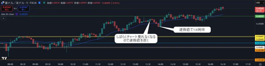 13:30 しばらくチャートを見れなくなるので5分と15分のMAを頼りに逆指値を置く