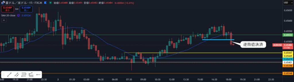 5分で半分、15分でもう半分決済する予定だが、今後の波次第。