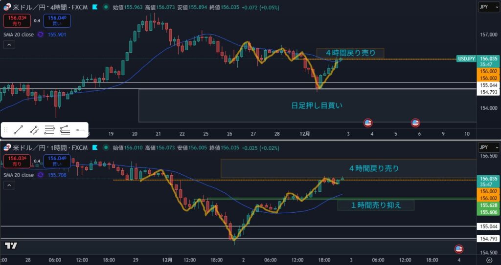 - 4時間の売りと日足の買いが両方いるエリアになる