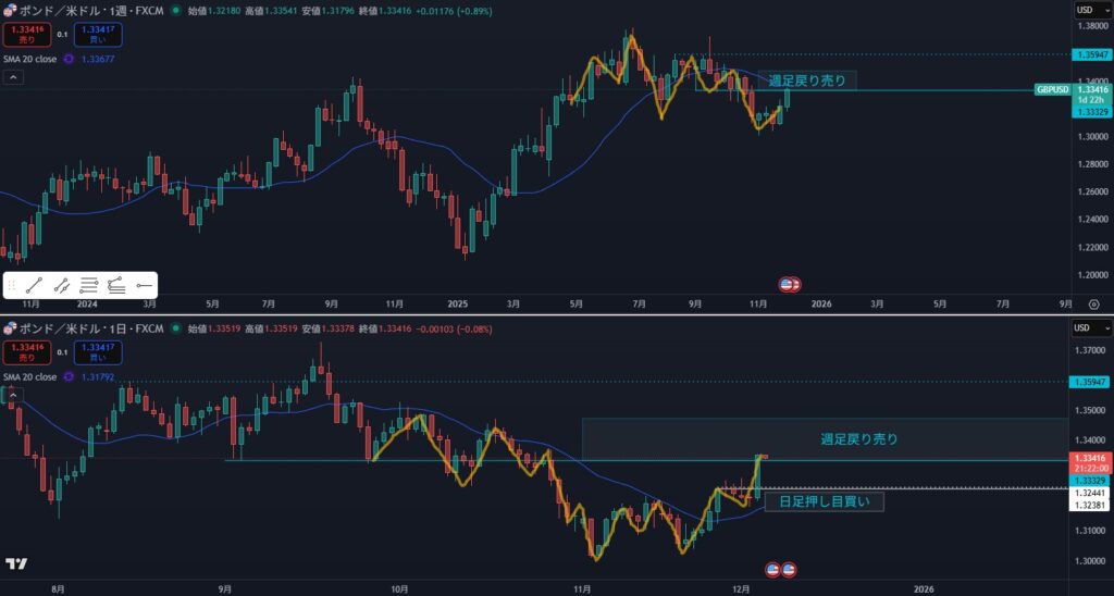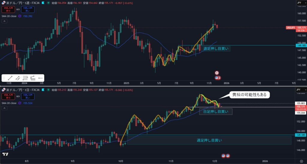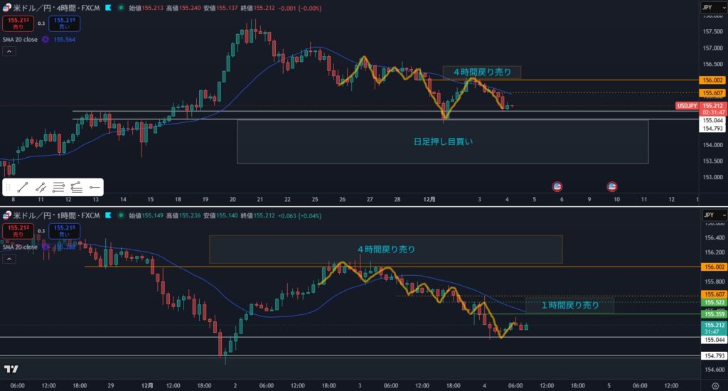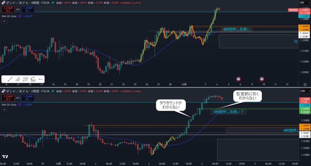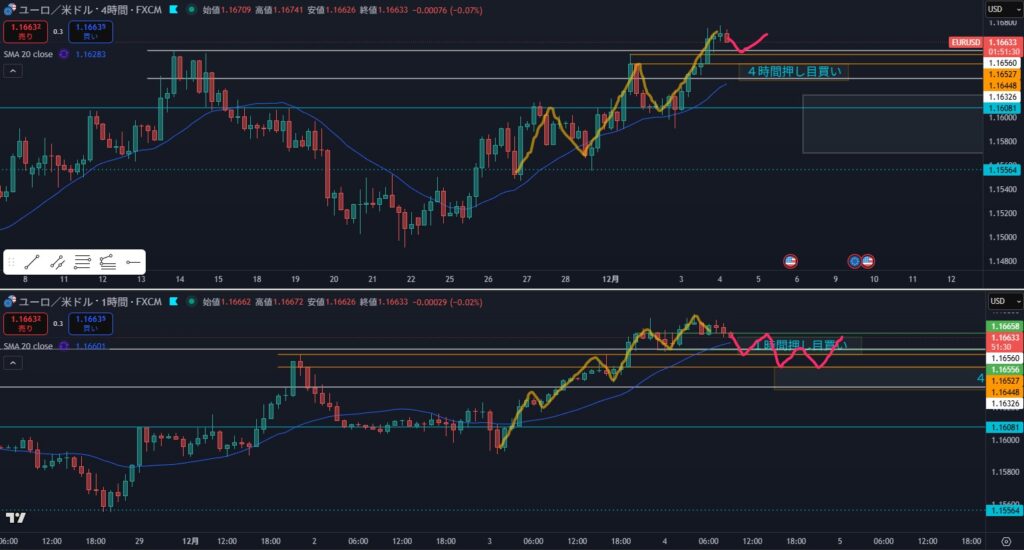 - 狙い:4時間の押し目買い(日足上昇継続)