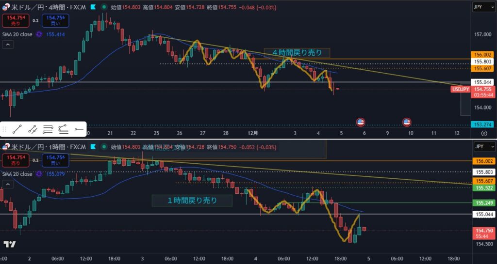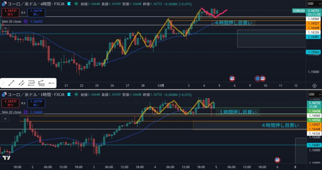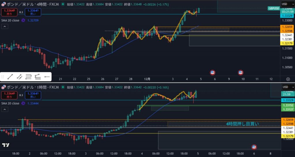- 狙い:4時間の押し目買い(日足上昇継続)