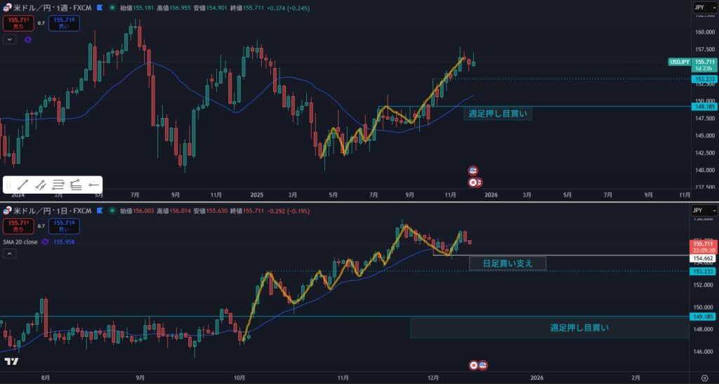 - 買いを考えたいが、シナリオだと日足の押し目買いを大きく下抜けすることになるので考えにくい
