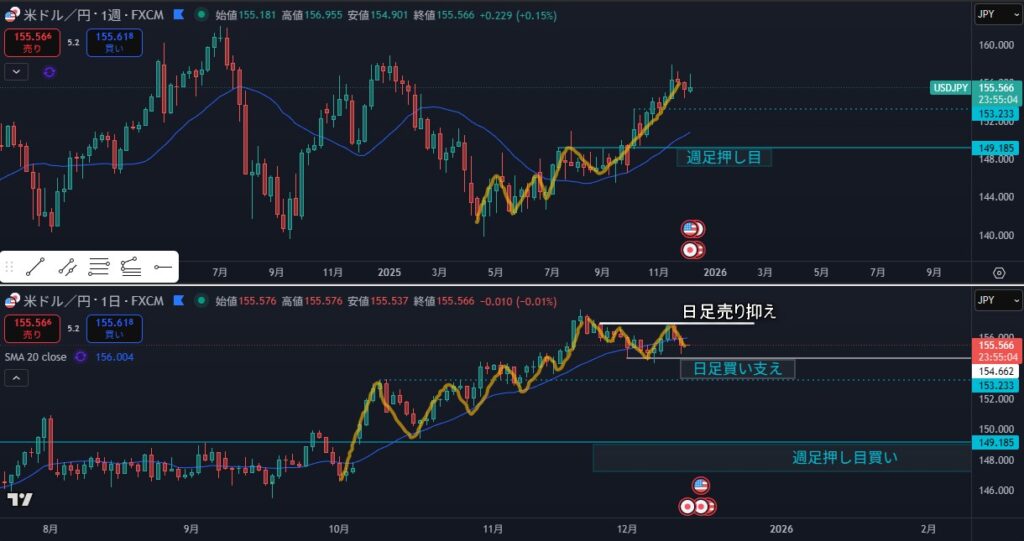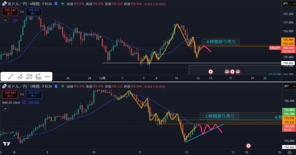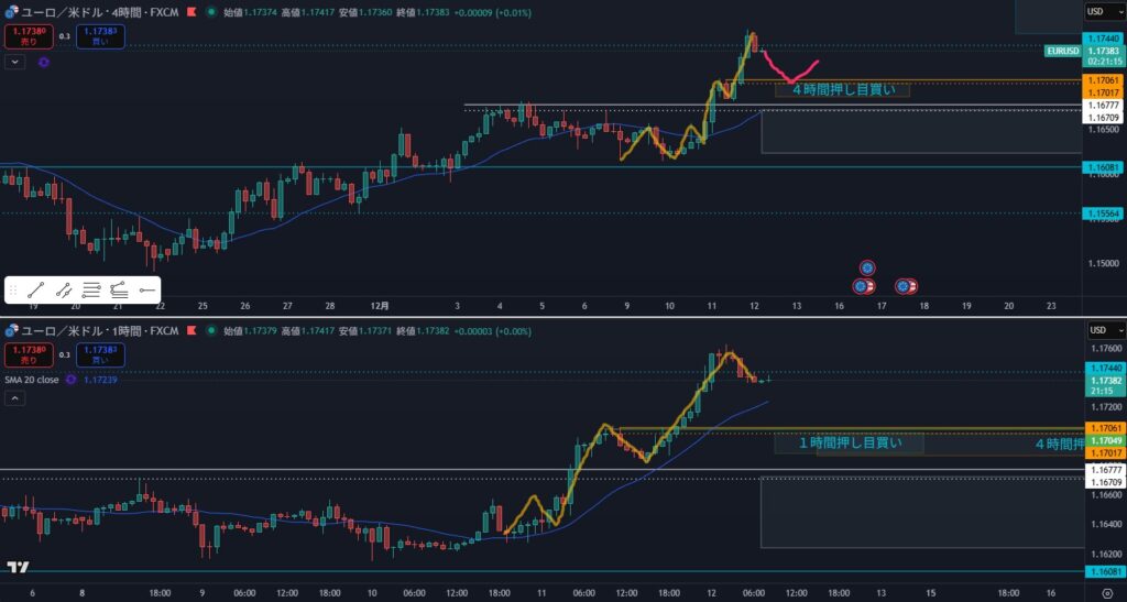 - 4時間の押し目買い狙い、攻防ラインを想定する