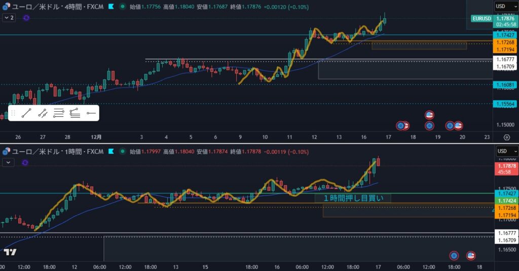 4時間全戻しのセオリーだと1時間トレンドフォローからのエントリだけど、なんかそのまま行きそうな気がしてブレイクでエントリ