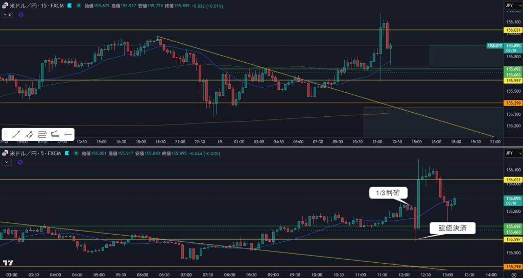 12:15 急な下落で残りの2/3建値決済。。。。